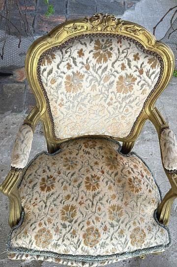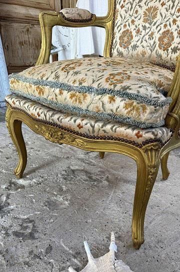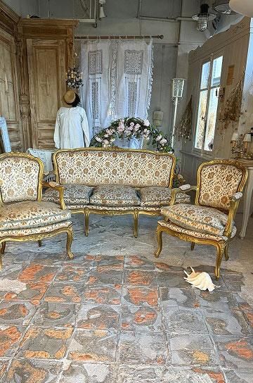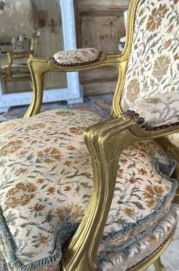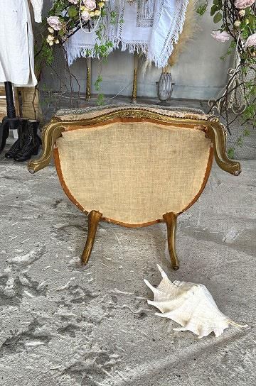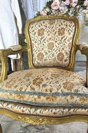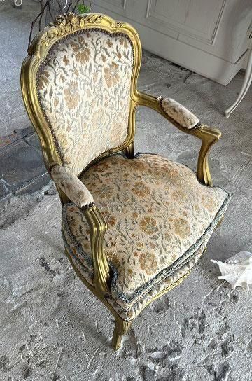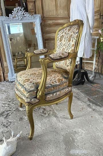 フレンチアンティークのローズ彫刻のサロンアームチェアb。豪華なブルージャガード生地張りとゴールドフレームのルイ15世アンティークソファです。ロココ調フレームは背もたれからアームの先まで流れる曲線を描いています。ひざ下の座面も曲線を描いて。センターにシンメトリーのローズが彫刻された優雅な美しさを放つサロンアームチェア。マットなゴールド塗装が落ち着きのある威厳を感じさせます。背もたれは光沢のあるジャガードが薄っすらとブルーとアンバーが交互に輝きます。座面はリバーシブルの共布で弾力性のある新品フェザークッションが入ってふっくらして座り心地のよさは抜群です。美しい曲線のアームもファブリック張りでフロントから見ると脚へとつながる美しいシルエットを描いています。座面の下のチェアレールもアカンサスと花の透かし模様で飾られて。脚はカブリオールレッグで、ちょこんと立つ姿が華奢で優雅な印象です。ダイニングチェアーやリビングで豪華なカフェの時間を楽しんだり、ショップのディスプレーやスタジオの撮影にも存在感を発揮してくれます。重厚で煌びやかな雰囲気が絵になる佇まいのフレンチアンティークのローズ彫刻のサロンアームチェアーです。 | ![]() | ||||||||||||||
