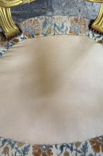 ![]() 豪華なブルージャガード生地張りとゴールドフレームのルイ15世アンティークソファです。 | ![]() ロココ調フレームは背もたれからアームの先まで流れる曲線を描いています。 | ||||||||||||||