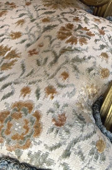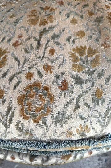 ![]() 背もたれは光沢のあるジャガードが薄っすらとブルーとアンバーが交互に輝きます。 | ![]() 座面はリバーシブルの共布で弾力性のある新品フェザークッションが入ってふっくらして座り心地のよさは抜群です。 | ||||||||||||||