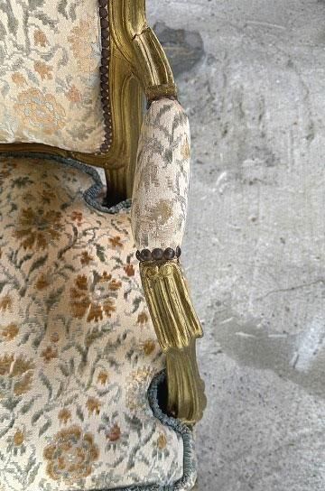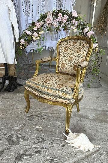 ![]() マットなゴールド塗装が落ち着きのある威厳を感じさせます | ![]() ひざ下の座面も曲線を描いて。センターにシンメトリーのローズが彫刻された優雅な美しさを放つサロンアームチェア。 | ||||||||||||||