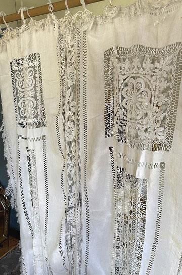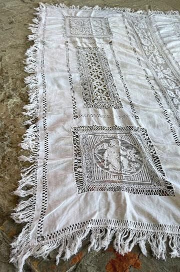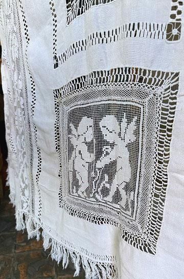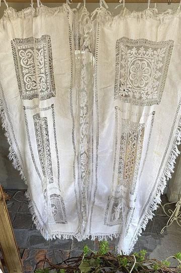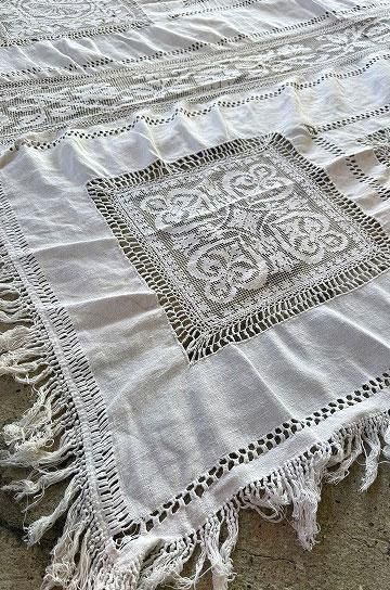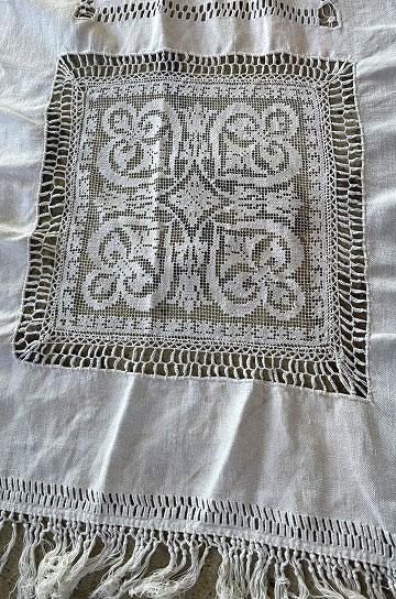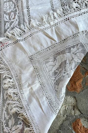 コーナーにエンジェル2体パターンのフィレレース、所々を手づくりのクロシェでパッチワークされたリネンレース。