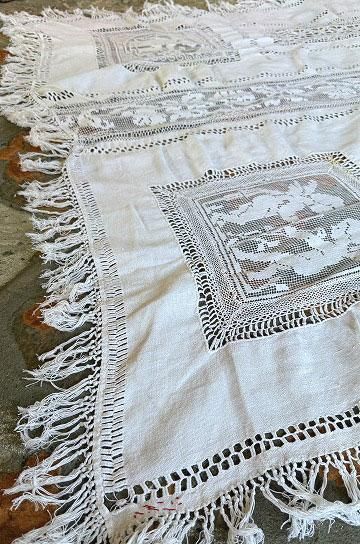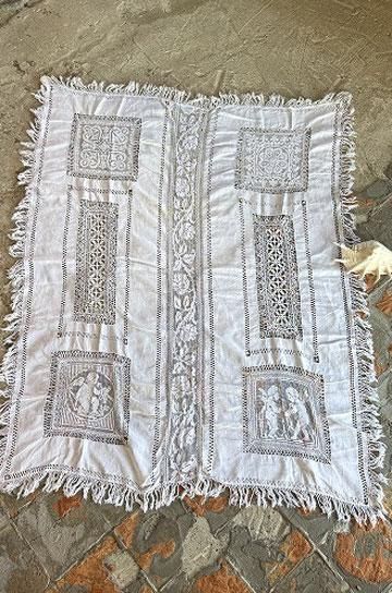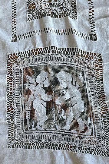 フレンチリネン地にエンジェルのレースがパッチワークされたアンティークフィレレース