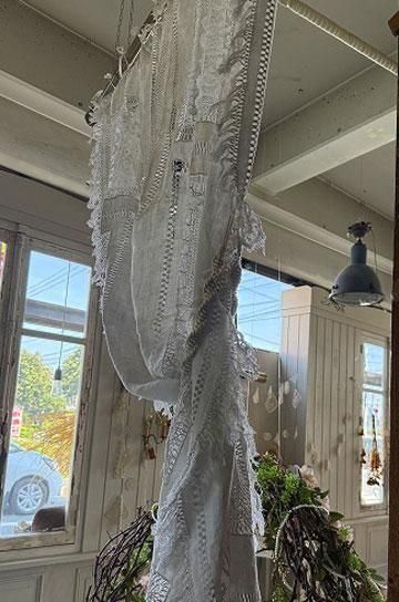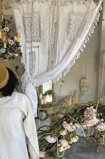 備考フレンチリネン地にエンジェルのフィレレースとクロシェレースがパッチワークされたリネンのフィレレース。