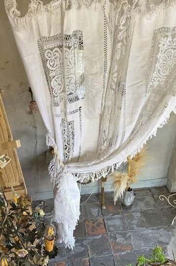 フレンチアンティークのエンジェル模様のフィレレースカーテン。コーナーにエンジェル2体パターンのフィレレース、所々を手つくりのクロシェでパッチワークされたリネンレース。透け感のある大きな網地模様が不透明のざっくりリネン地アレンジされて。リネンから模様が透かされてくっきりと美しく映えるフィレレースです。糸の密度で表現された美しい図案はデザインのセンスが求められ、表現力の素晴らしいフィレレースです。レースの周囲にフリンジが仕立てられて垂れた房のシルエットが可愛らしい。ソファーカバーにしたり、部屋の間仕切りや玄関先の目隠しカーテンにセンス良く見えるカフェカーテンになります。又はテレビの機械的な部分の目隠しにも手ごろなサイズです。人気のエンジェルとクロシェの丁寧なアンティークレース。年月を経過した風合いが雰囲気のエンジェル柄のフレンチアンティークフィレリネンレースです。