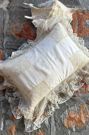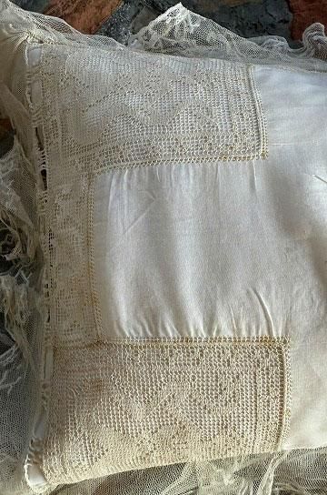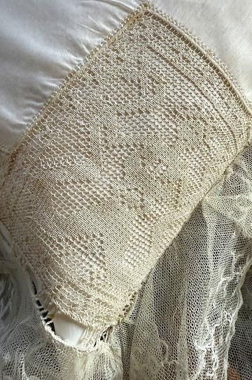 ![]() パネルはコーナーと周囲を囲むマシーンフィレレースのアンティークレース。 | ![]() 華奢で透明感のある美しいアンティークチュールレースクッション。 | ||||||||||||||