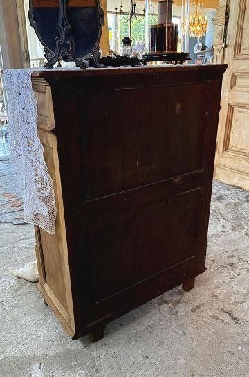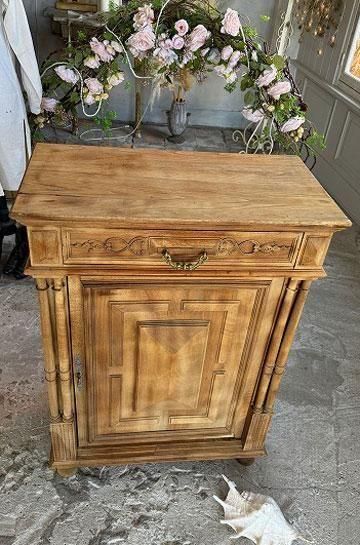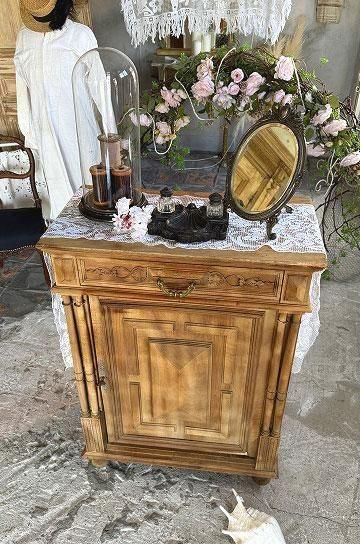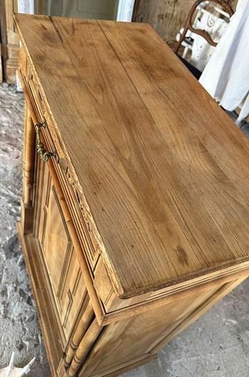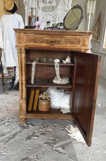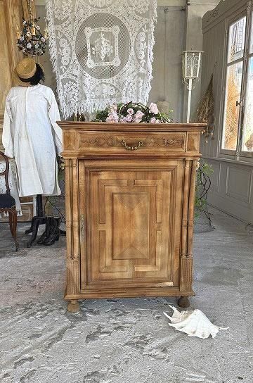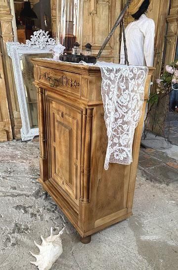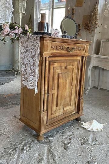 フレンチアンティークのオーク製オークカウンターテーブル。サンドブラストされてナチュラル肌の白木のオーク製の優しいカップボード。扉と引き出しには凹凸の深いダイヤ型の重厚なパネル扉です。引き出しにも同じデザインでモールディングのレリーフもついてきりっとメリハリのあるデザインのオークキャビネットです。お店のエントランスの案内用のカウンターとして使われていたオークテーブル。店員さん用の作業台やレジ台として、またハイスツールを合わせればちょっとしたテーブルとしても使えそうなカウンターテーブルです。広いワイドな引出にはテーブル用ナプキンやカトラリーが収納出来て。ボトムの開きは、収納力もたっぷり。年月を経過したナチュラルオークの木肌は、古い木の温もりが伝わってくる、優しく柔らかい印象。フレンチアンティークのオークカウンターテーブルです。 | ![]() | ||||||||||||||