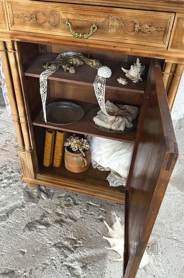 ![]() 引き出しにも同じデザインでモールディングのレリーフもついてきりっとメリハリのあるデザインのオークキャビネットです。 | ![]() お店のエントランスの案内用のカウンターとして使われていたオークテーブル。 | ||||||||||||||
