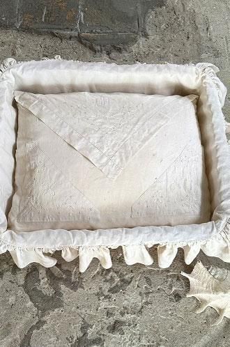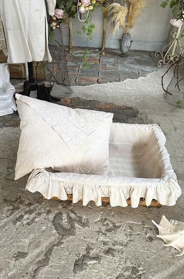 フレンチアンティークのモノグラムリネンカバークッション付パニエ。平らで大き目の統制のフレンチパニエです。縦シルエットはクロスして持ち手の淵には三つ編み状の使いやすい持ち手のアンティークパニエです。フランス製の籐は軽くてしなやかさがあり、古くなるにつれ色艶に深みが出てきます。フランスの家庭で大切に受け継がれてきたアンティークパニエ。”HとA”のモノグラムとカットワークされた繊細なデザインのフレンチリネンで作られたクッションカバーです。中芯はふんわりフェザーがセット。20cmの低めのアンティークパニエで、ワンちゃん猫っちゃんのお昼寝ベッドとして。さりげなくインテリアに溶け込みながらおしゃれに見せるインテリアとして。大き目サイズが存在感のある、フレンチアンティークパニエです。 | ![]() | ||||||||||||||