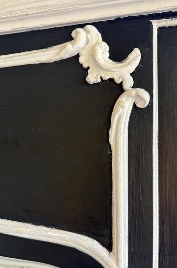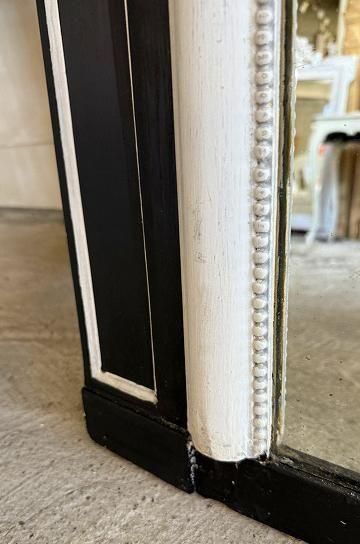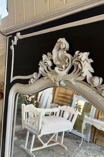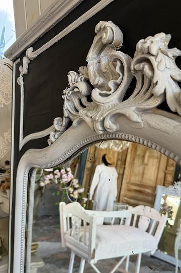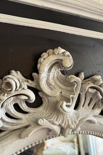 ![]() 立体的にフレームから飛び出した形のアカンサス装飾はブラックのフレームに映えるブルーホワイトの塗装がされています。 | ![]() ミラーリムにはネックレースのようなビーディング装飾が立体感を増して。 | ||||||||||||||