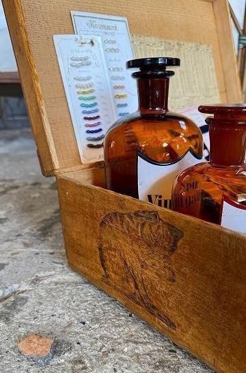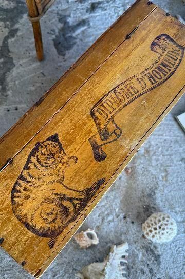 フレンチアンティークの仔猫の木箱。DIPJOME D’HONNEURステンシル入り木製ボックスです。猫のステンシルがマークが可愛い粉せっけんの洗剤メーカーの木箱です。蓋もついて5、6mmの厚みのパインの板で作られていて、ややっゆがみはありますが、留め金具もオリジナルで引っ掛けて止まります。箱の中には、くしやブラシ、タオル入れなど見せるインテリアとして欠かせない仔猫マークの古いアンティークケースです。このまま雑貨屋さんやサロン、ショップやアトリエのディスプレーとして当時の生活が伝わってくる空間作りに。小物をアレンジしてディスプレイを楽しみたい、古びた風合いがノスタルジックで味わい深い、フレンチアンティークの仔猫の木箱です。 | ![]() | ||||||||||||||