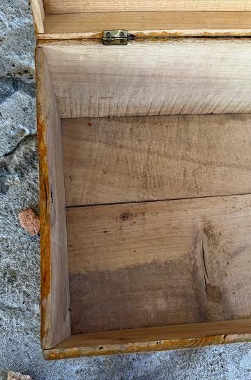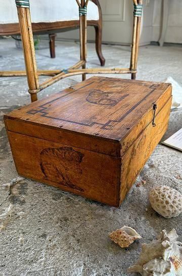 ![]() 蓋もついて5、6mmの厚みのパインの板で作られていて、ややっゆがみはありますが、留め金具もオリジナルで引っ掛けて止まります | ![]() 箱の中には、くしやブラシ、タオル入れなど見せるインテリアとして欠かせない仔猫マークの古いアンティークケースです。 | ||||||||||||||