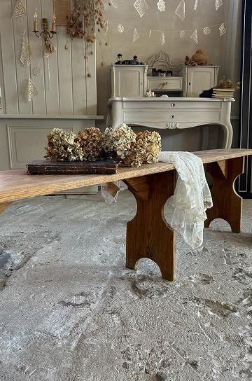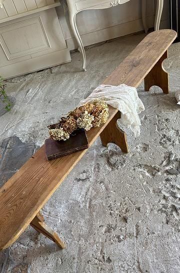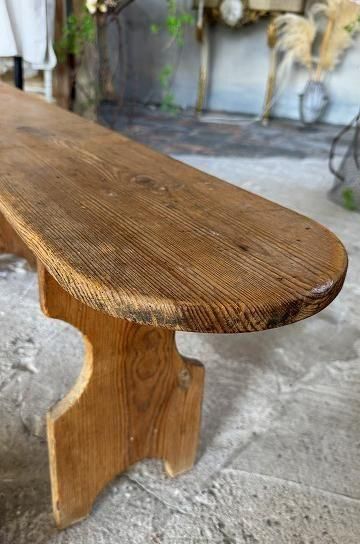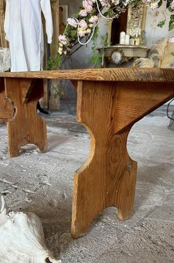 フレンチアンティークのパインロングベンチ。無垢のパイン材1枚で作られた懐かしい雰囲気のするロングベンチ。使い込まれて、木目が透けて凹凸になった、古材の感触が楽しめるアンティークベンチです。パインの一枚板の両サイドの先端が丸くカットされて、長年愛用されてきた心地良さが伺えます。座面の高さは45cmで、ダイニングテーブルと合わせて、家族で過ごすベンチソファのあるダイニングチェアとして。ウィークエンドのファミリーパーティーにテラスで過ごすブランチチェアとして。突然お客様が増えても詰めて横に座れるロングベンチです。年月を経過したパイン材は乾燥して固く引き締まり、年輪が浮き出たアンティーク独特の魅力溢れる風合いになっています。新しい木には無い存在感で部屋の空気感を創り上げてくれる、フレンチアンティークパインロングベンチです。 | ![]() | ||||||||||||||