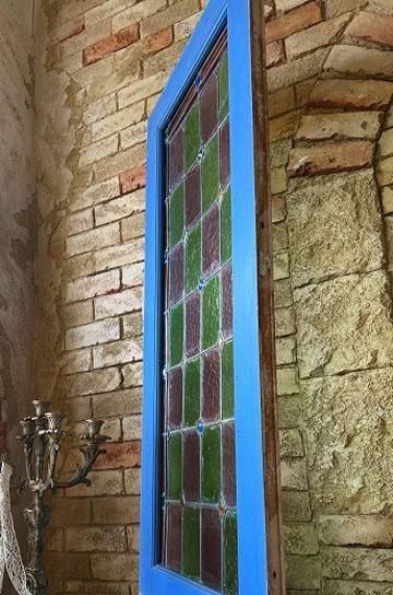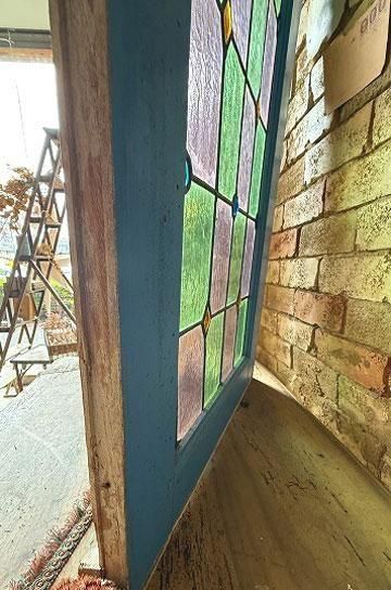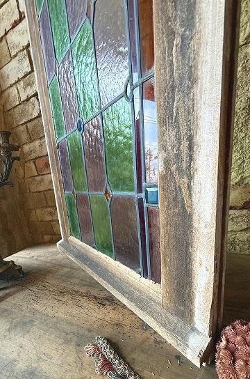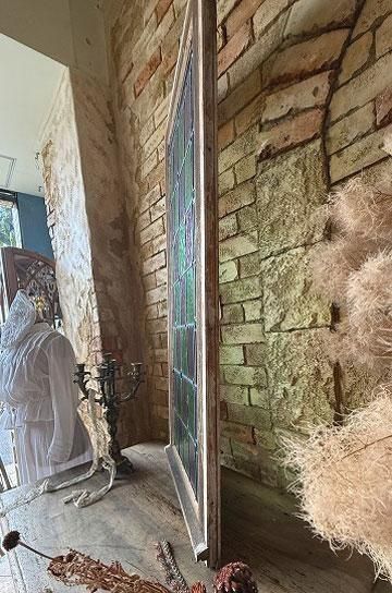 フレンチアンティークのステンドグラス。細長いシルエットで教会の2枚組だったステンドグラスの一枚のステンドグラスです。グリーンとボルドー色の格子のステンドグラスにダイヤ型のブルーやオレンジの宝石が輝くチャペルのステンドグラス。シックでクラシカルな佇まいが深い神秘的な美しいステンドグラス。木製フレームは、ステンドグラスに合わせてブルーに塗装された木製のフレームで一体感があります。表は深いブルー色、裏は木枠色を活かしたナチュラルな塗装。細長いデザインのステンドグラスは、格子状の鉛のリードで止められてクリアテキスチャーガラスが自然光を優しく取り込み、絵画のような世界観を創ります。周囲にはルージュのレッドが格子を囲んで周囲を縁取りっています。窓としてはもちろん、壁面に埋めたり、アイデアでインテリアに取り入れたい。または窓辺に立てかけたり、光を通して美しさが際立つ、フレンチアンティークのステンドグラスです。 | ![]() | ||||||||||||||