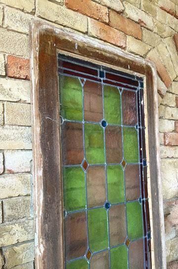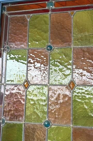 ![]() 細長いシルエットで教会の2枚組だったステンドグラスの一枚のステンドグラスです。 | ![]() グリーンとボルドー色の格子のステンドグラスにダイヤ型のブルーやオレンジの宝石が輝くチャペルのステンドグラス。 | ||||||||||||||