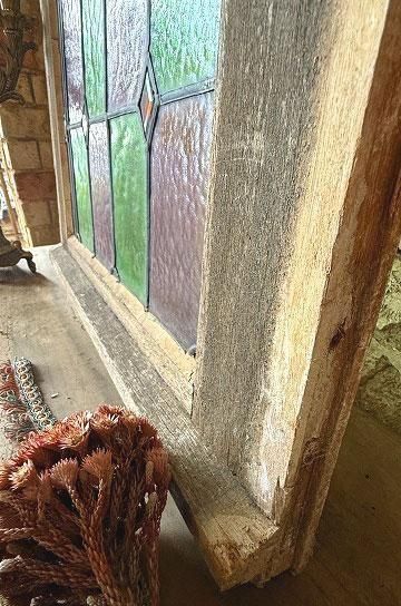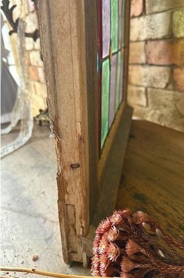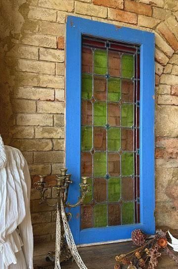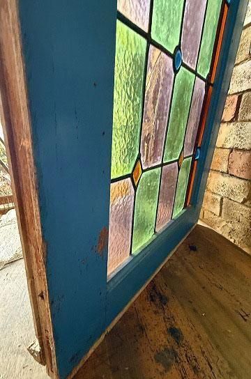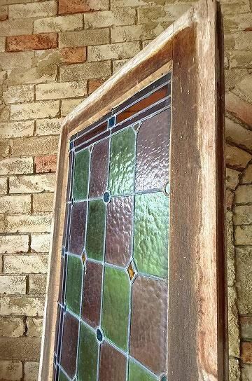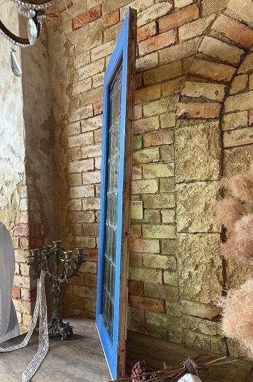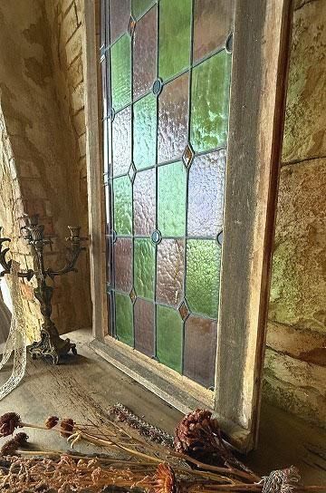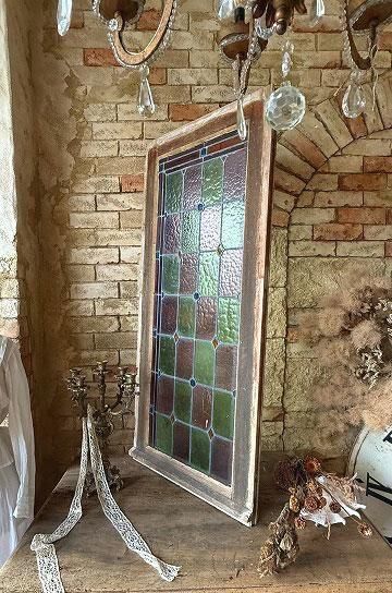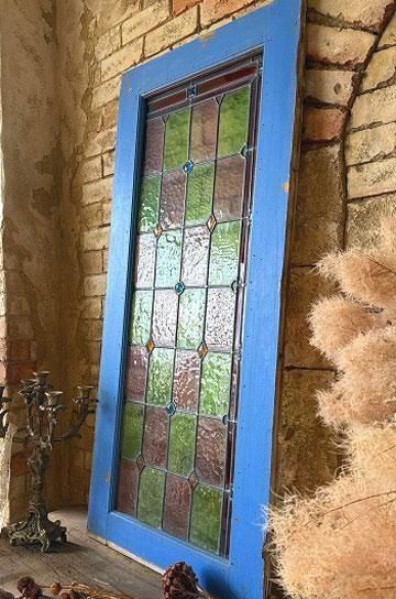 フレンチアンティークのステンドグラスb。細長いシルエットで教会の2枚組だったステンドグラスの一枚のステンドグラスです。グリーンとボルドー色の格子のステンドグラスにダイヤ型のブルーやオレンジの宝石が輝くチャペルのステンドグラス。シックでクラシカルな佇まいが深い神秘的な美しいステンドグラス。木製フレームは、ステンドグラスに合わせてブルーに塗装された木製のフレームで一体感があります。表は深いブルー色、裏は木枠色を活かしたナチュラルな塗装。細長いデザインのステンドグラスは、格子状の鉛のリードで止められてクリアテキスチャーガラスが自然光を優しく取り込み、絵画のような世界観を創ります。周囲にはルージュのレッドが格子を囲んで周囲を縁取りっています。窓としてはもちろん、壁面に埋めたり、アイデアでインテリアに取り入れたい。または窓辺に立てかけたり、光を通して美しさが際立つ、フレンチアンティークのステンドグラスです。 | ![]() | ||||||||||||||