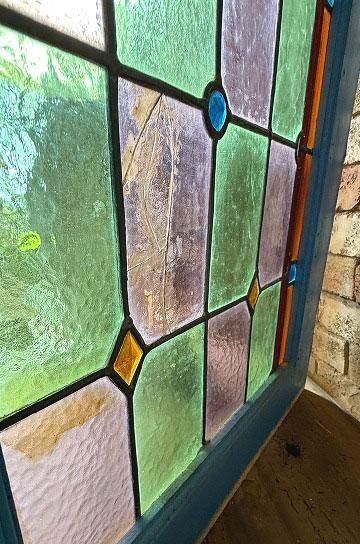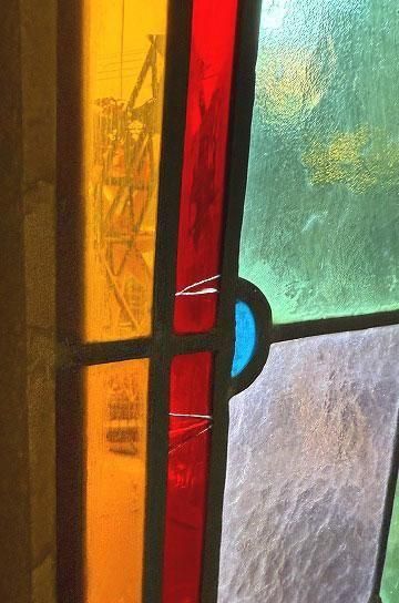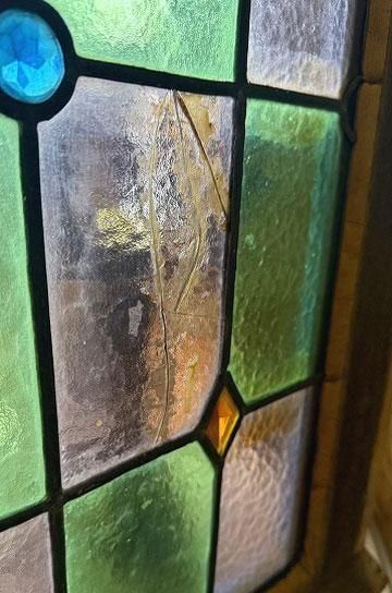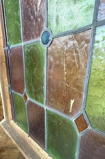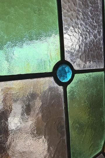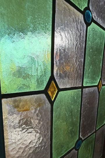 ![]() 細長いシルエットで教会の2枚組だったステンドグラスの一枚のステンドグラスです。 | ![]() グリーンとボルドー色の格子のステンドグラスにダイヤ型のブルーやオレンジの宝石が輝くチャペルのステンドグラス。 | ||||||||||||||