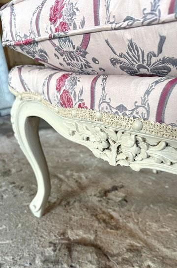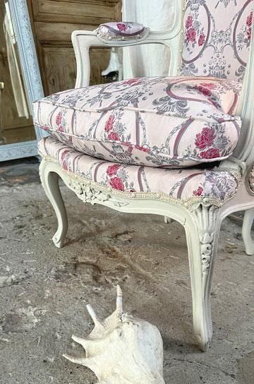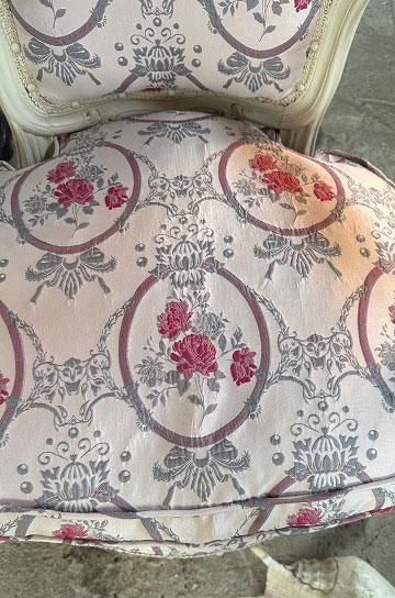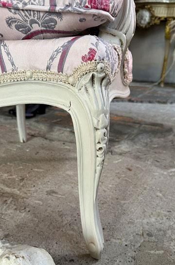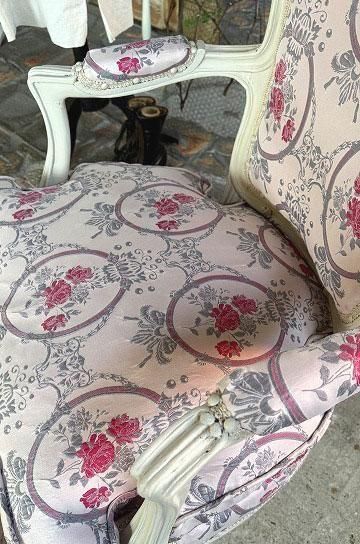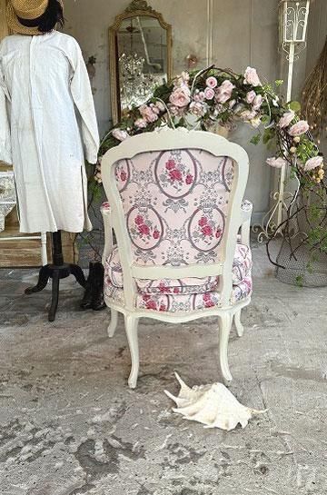 ![]() ピンクローズのジャガード生地張りでロココ調のルイ15世アンティークサロンチェアです。 | ![]() ロココ調フレームは背もたれからアームの先まで流れる曲線を描いています。 | ||||||||||||||