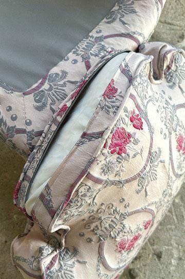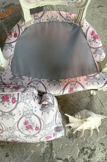 ![]() 座面はリバーシブルカバーになっていて、新品フェザークッションが入ってふっくらして華やか。 | ![]() 美しい曲線のアームもファブリック張りで快適。 | ||||||||||||||