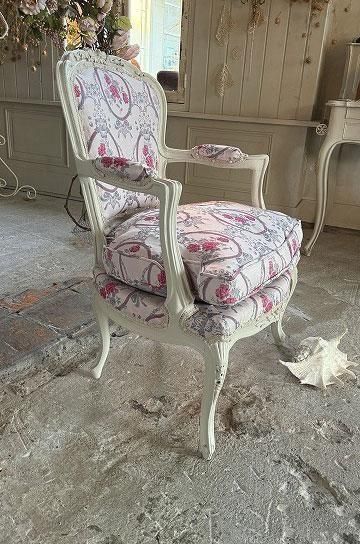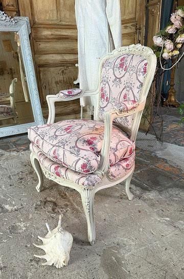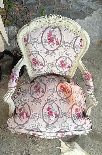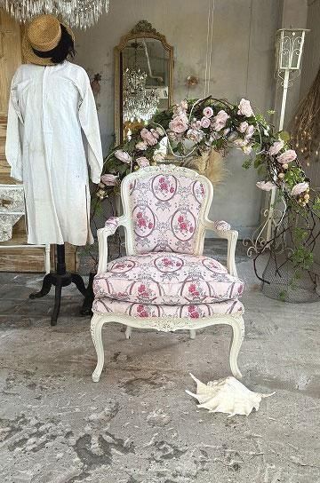 フレンチアンティークのローズジャガードアームチェア。ピンクローズのジャガード生地張りでロココ調のルイ15世アンティークサロンチェアです。ロココ調フレームは背もたれからアームの先まで流れる曲線を描いています。ひざ下の座面も曲線を描いて。センターにシンメトリーのローズが彫刻されて優雅な美しさを放つアンティークアームチェア。マットなホワイトがピンク色のセンチメンタルな落ち着きのある清楚な雰囲気。背もたれは光沢のあるジャガードがピンクローズとグレーのレリーフが交互に光ります。座面はリバーシブルカバーになっていて、新品フェザークッションが入ってふっくらして華やか。美しい曲線のアームもファブリック張りで快適。ローズを中心にフロントから見ると脚へとつながる美しいシルエットを描いています。脚はカブリオールレッグで、ちょこんと立つ姿が華奢で優雅な印象です。ローズ彫刻の装飾家具として、華やかな存在感を発揮してくれます。フレンチアンティークのローズ彫刻のアームチェアです。 | ![]() | ||||||||||||||
