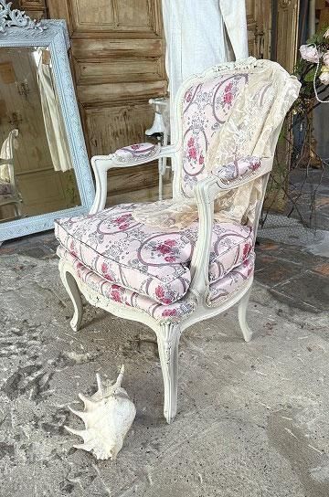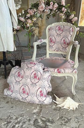 フレンチアンティークのローズジャガードアームチェアb。ピンクローズのジャガード生地張りでロココ調のルイ15世アンティークサロンチェアです。ロココ調フレームは背もたれからアームの先まで流れる曲線を描いています。ひざ下の座面も曲線を描いて。センターにシンメトリーのローズが彫刻されて優雅な美しさを放つアンティークアームチェア。マットなホワイトがピンク色のセンチメンタルな落ち着きのある清楚な雰囲気。背もたれは光沢のあるジャガードがピンクローズとグレーのレリーフが交互に光ります。座面はリバーシブルカバーになっていて、新品フェザークッションが入ってふっくらして華やか。美しい曲線のアームもファブリック張りで快適。ローズを中心にフロントから見ると脚へとつながる美しいシルエットを描いています。脚はカブリオールレッグで、ちょこんと立つ姿が華奢で優雅な印象です。ローズ彫刻の装飾家具として、華やかな存在感を発揮してくれます。フレンチアンティークのローズ彫刻のアームチェアです。 | ![]() | ||||||||||||||