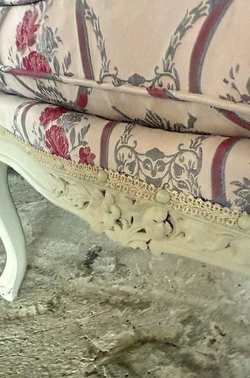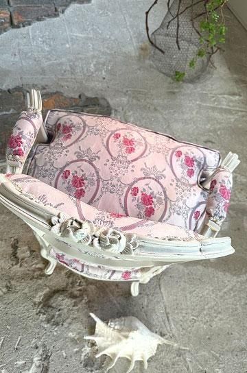 ![]() ひざ下の座面も曲線を描いて。センターにシンメトリーのローズが彫刻されて優雅な美しさを放つアンティークアームチェア。 | ![]() マットなホワイトがピンク色のセンチメンタルな落ち着きのある清楚な雰囲気。背もたれは光沢のあるジャガードがピンクローズとグレーのレリーフが交互に光ります。 | ||||||||||||||