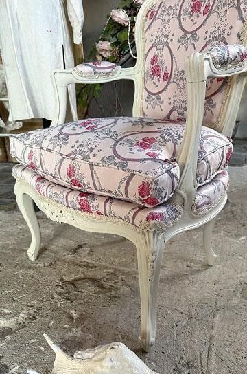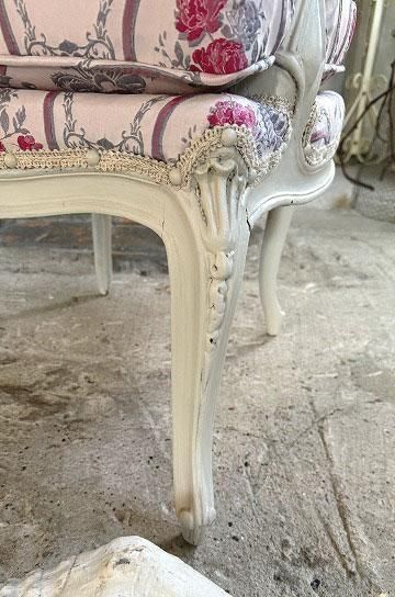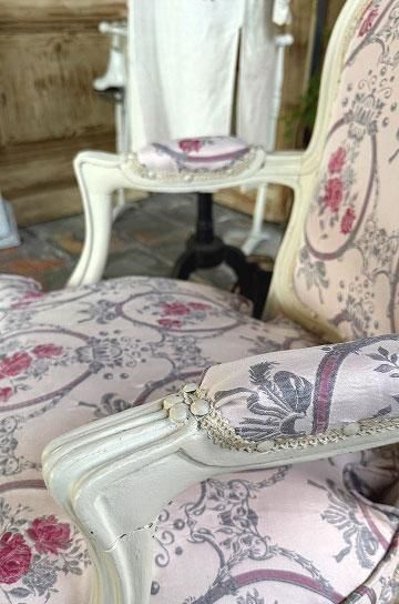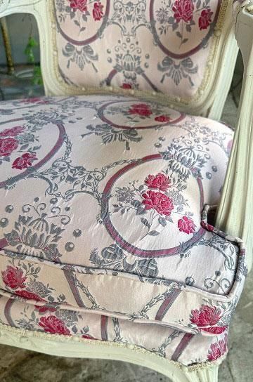 ![]() ピンクローズのジャガード生地張りでロココ調のルイ15世アンティークサロンチェアです。 | ![]() ロココ調フレームは背もたれからアームの先まで流れる曲線を描いています。 | ||||||||||||||
