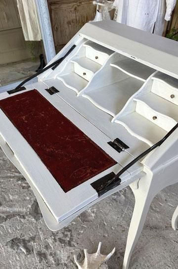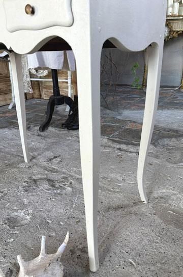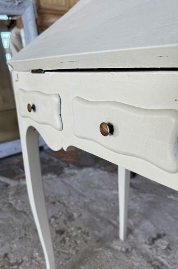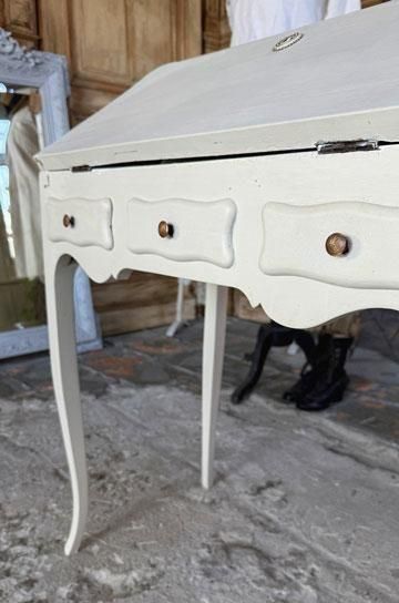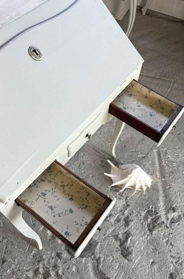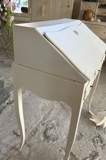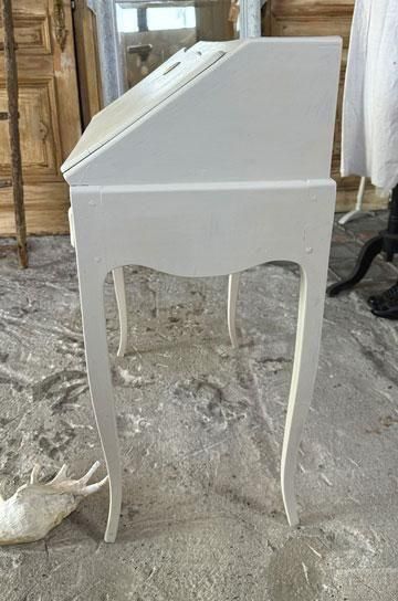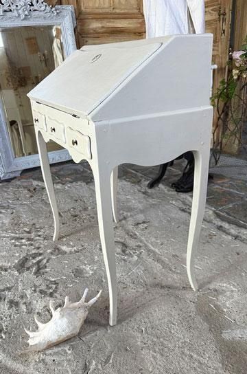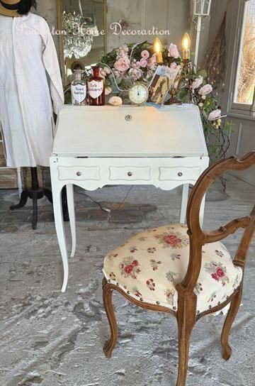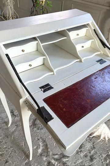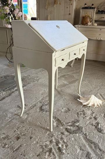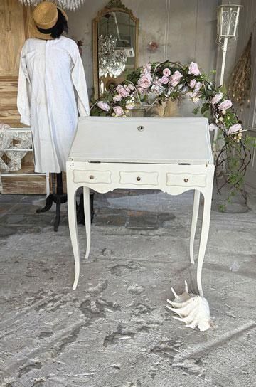 | フレンチアンティークのライティングビュロー。小さなデスクに本棚と小引出が付いて、カリグラフィーや刺繍などの趣味の部屋用のデスクとして最適なサイドテーブル。ルイ15世スタイルの特徴でもあるスラっと細い曲線に流れる流線形の小引き出しがアクセントのアンティークテーブル。サーペンタインシルエットの天板は、リムが丸く面取りになっていて優しい雰囲気。ホワイトの塗装が清楚で凛と美しいシルエットです。上部に引き出しが4か所あって、ボタンやビーズ等小さな、小物を分けて収納してみたいドローイングテーブルです。お気に入りの椅子と合わせて、書き物やPC用デスク、作業デスクにしたり、ドレッシングテーブルとして、大切な時間をゆったりと過ごしたくなるルイ15世様式のロココ調ライティングビュローです。 |  | ||||||||||||||