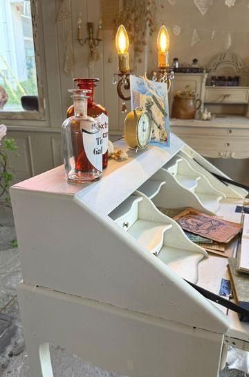 |  上部に引き出しが4か所あって、ボタンやビーズ等小さな、小物を分けて収納してみたいドローイングテーブルです。 |  お気に入りの椅子と合わせて、書き物やPC用デスク、作業デスクにしたり、ドレッシングテーブルとして、 | ||||||||||||||