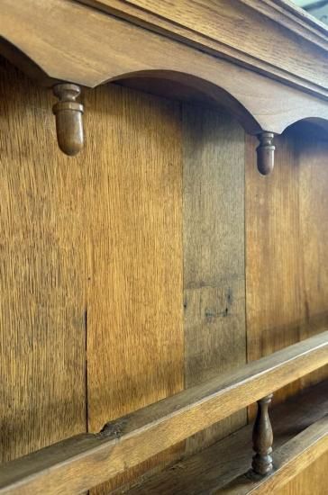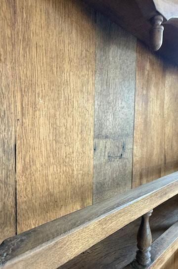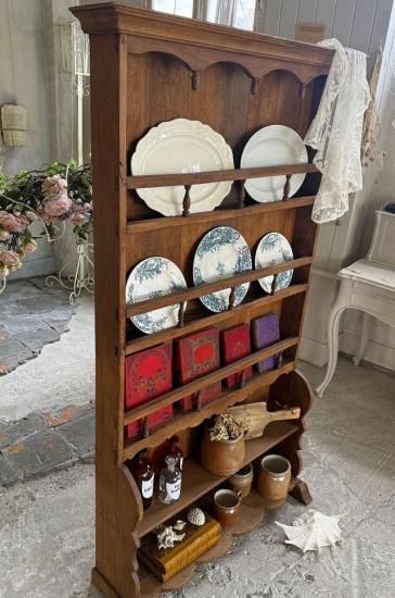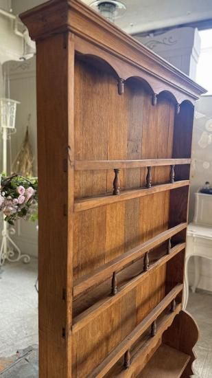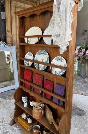 ![]() 下段の広めの棚板は大皿やポット、花器などのディスプレイに適し、上部の細いラック部分はプレートや小ぶりな陶器、グラスを並べて飾るのに最適。年月を経た木肌の深みがアンティークならではの風格を醸し出し、置かれるオブジェや器をより美しく引き立ててくれます。 | ![]() アンティークプレートラックならではの風合いと重厚さで、ブロカント小物や陶器コレクションを優雅に演出してくれる逸品です。 | ||||||||||||||
