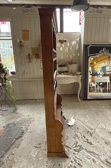 | フレンチアンティークのプレートラックシェルフ。19世紀末から20世紀初頭にかけて、フランスの家庭で食器や陶器を美しく飾りながら収納していたウォールラックです。背板には無垢材の温かみある木目が広がり、細身のスピンドル装飾が軽やかなアクセントを添えています。トップ部分にはアーチ型のカットワークが施され、棚板の曲線的なラインとともに、シンプルながらも優美な佇まいを演出しています。下段の広めの棚板は大皿やポット、花器などのディスプレイに適し、上部の細いラック部分はプレートや小ぶりな陶器、グラスを並べて飾るのに最適。年月を経た木肌の深みがアンティークならではの風格を醸し出し、置かれるオブジェや器をより美しく引き立ててくれます。こちらは壁掛けではなく置き型タイプのプレートラックですので、設置も容易で、移動やレイアウト変更にも柔軟に対応できます。ダイニングやキッチンの壁面に沿わせて置くだけで空間を華やかに彩り、リビングやサロンのディスプレイ家具としてもおすすめ。アンティークプレートラックならではの風合いと重厚さで、ブロカント小物や陶器コレクションを優雅に演出してくれる逸品です。 | ![]() | ||||||||||||||