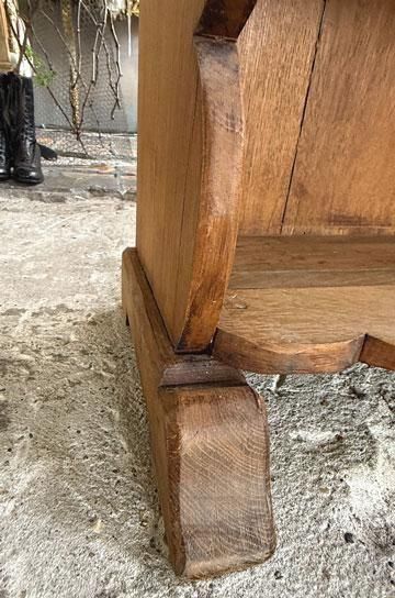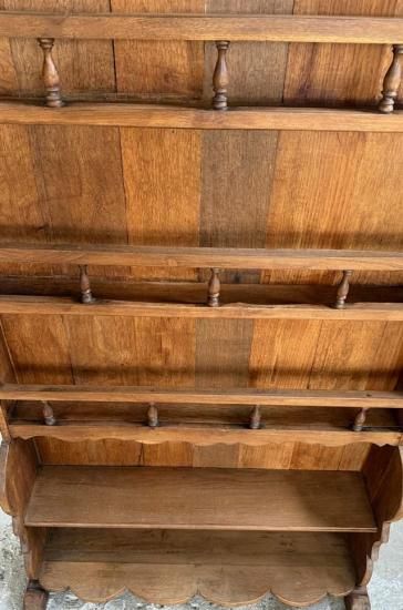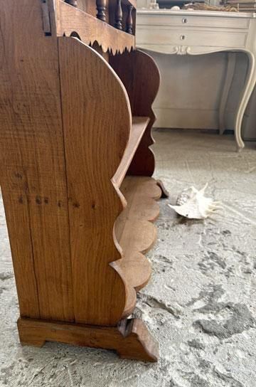 ![]() 19世紀末から20世紀初頭にかけて、フランスの家庭で食器や陶器を美しく飾りながら収納していたウォールラックです。 | ![]() 細身のスピンドル装飾が軽やかなアクセントを添えています。トップ部分にはアーチ型のカットワークが施され、棚板の曲線的なラインとともに、シンプルながらも優美な佇まいを演出しています | ||||||||||||||