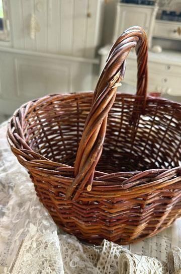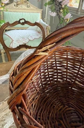 ![]() ハンドルは色が少し焼けてナチュラルから茶色へと変化して懐かしい風合いです。 | ![]() ラウンド型の家庭で大切に受け継がれてきたアンティークパニエ。 | ||||||||||||||