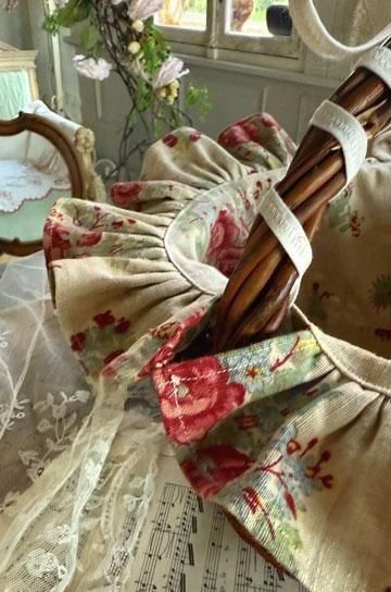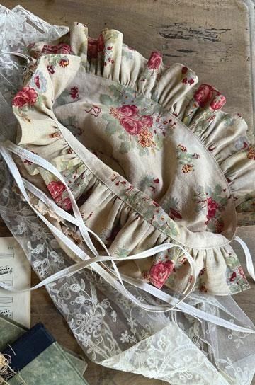 ![]() 内側にローズのヴィンテージ生地のカバーがついたラウンドパニエ。 | ![]() ラウンドの周囲からアーチ状にもち上がったハンドルを上に引っ掛けて。 | ||||||||||||||