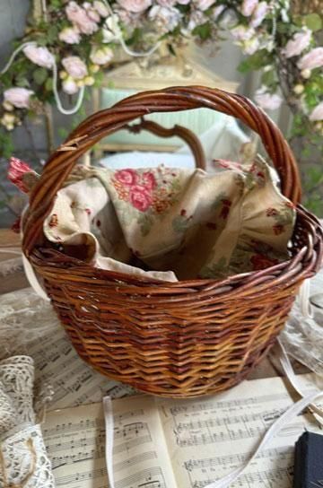 フランスアンティークのアンティークパニエ。内側にローズのヴィンテージ生地のカバーがついたラウンドパニエ。ラウンドの周囲からアーチ状にもち上がったハンドルを上に引っ掛けて。テーブルにフルーツの盛り合わせでディスプレイしてみたり。趣味の小物入れにしたりと実用的なパニエ。ブリュターニュ地方では収穫にハンドルパニエで使われていました。ハンドルは色が少し焼けてナチュラルから茶色へと変化して懐かしい風合いです。ラウンド型の家庭で大切に受け継がれてきたアンティークパニエ。マルシェへの買い物やキッチンのディスプレー兼収納としてはもちろん、普段は小物やワンちゃんの衣装などを収納しながらの見せる、ディスプレーとしても。さりげなくインテリアに溶け込みながら、おしゃれに絵になるフレンチアンティークパニエです。 | ![]() | ||||||||||||||