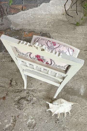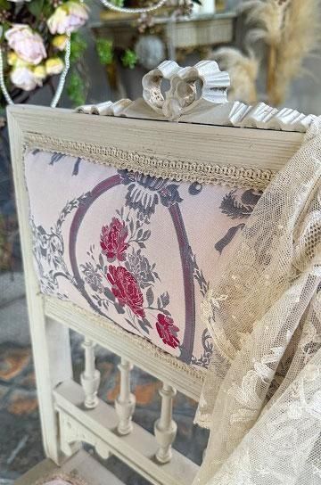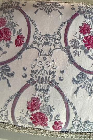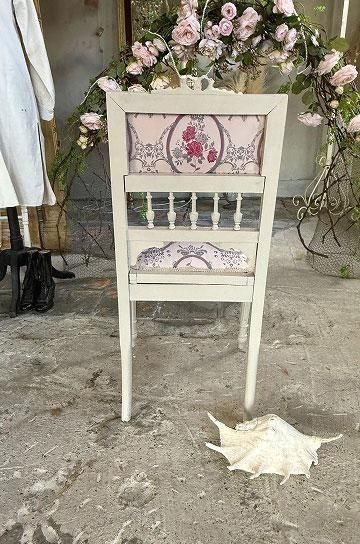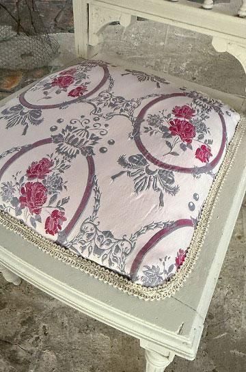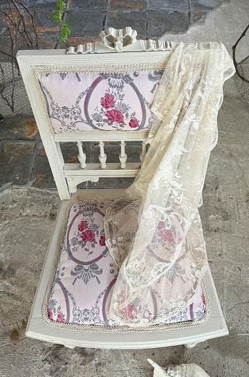 薄っすらピンク地にピンクローズのジャガード織の座面と背もたれが華奢な白いフレームとロマンチックな雰囲気です。