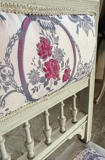 備考ウォルナッツ製のルイ16世フレンチチェア。座面と背もたれは薄いのピンク地にピンクローズ柄のジャガード織。