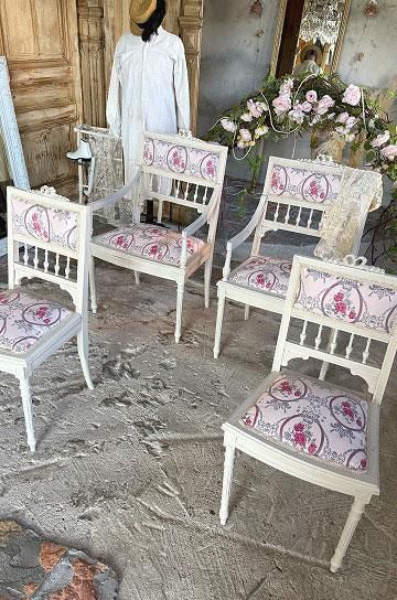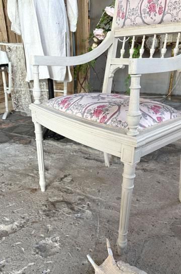フランスアンティークのルイ16世アームチェアd。 背もたれと座面にピンクローズのジャガード織のファブリックチェア。背もたれの中央にはリボン彫刻が幸せを象徴するリボンの彫刻がアクセントです。脚は細く直線的で脚の付けねの先に向かってフルーディングがすっきりと陰影を作ります。ロココ調に取り入れられたネオクラシカルデザインのアンティークアームチェアです。角型のすっきりとしたフレームにスピンドルが連なり、修道院の回廊をイメージする美しいシルエットです。薄っすらピンク地にピンクローズのジャガード織の座面と背もたれが華奢な白いフレームとロマンチックな雰囲気です。シンプルな角型のルイ16世アームチェアは、男爵用のヒジツキ出来るゆったりしたアームチェア。勿論、ダイニングテーブルに合せてサロンルームや寝室の装飾家具として。どこにもマッチする、ルイ16世フレンチアームチェアです。 | ![]() | ||||||||||||||