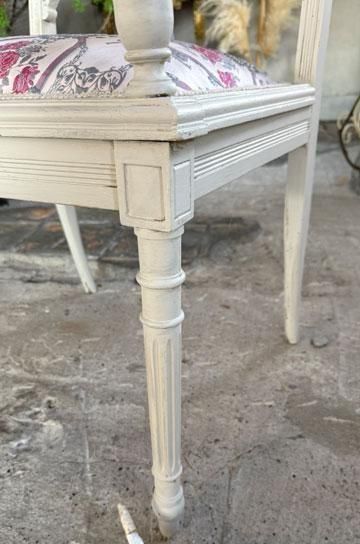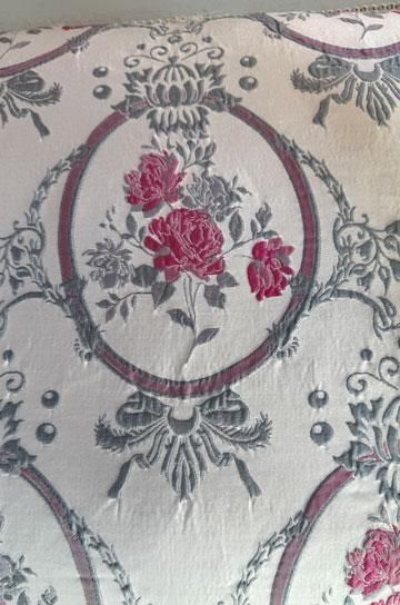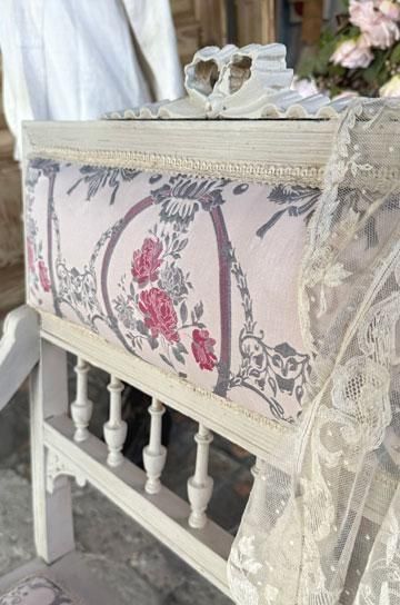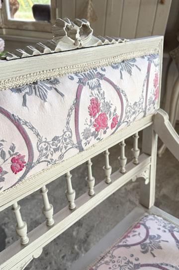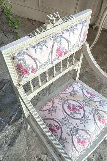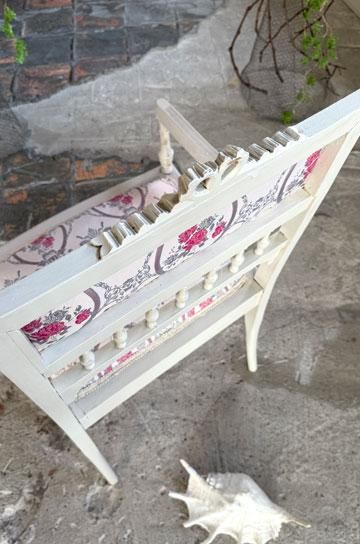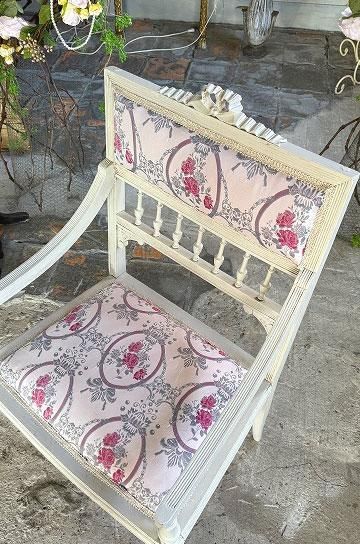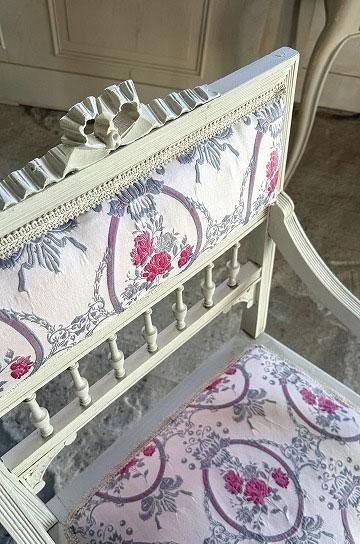 ![]() 薄っすらピンク地にピンクローズのジャガード織の座面と背もたれが華奢な白いフレームとロマンチックな雰囲気です。 | ![]() 角型のすっきりとしたフレームにスピンドルが連なり、修道院の回廊をイメージする美しいシルエットです。 | ||||||||||||||