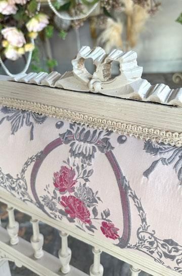 ![]() 背もたれと座面にピンクローズのジャガード織のファブリックチェア。 | ![]() 背もたれの中央にはリボン彫刻が幸せを象徴するリボンの彫刻がアクセントです。 | ||||||||||||||