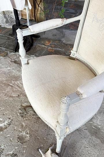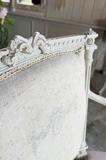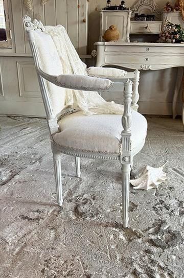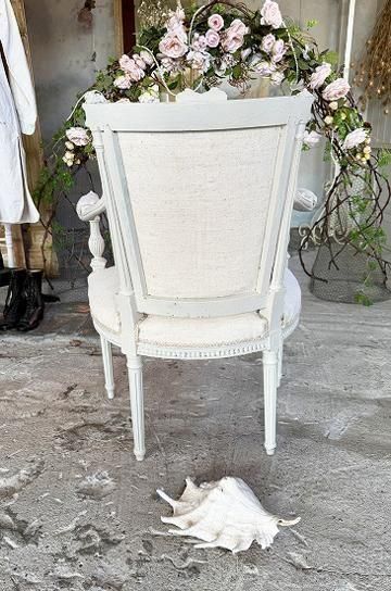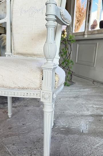 フレンチアンティークのルイ16世アームチェア。家具職人と彫刻職人によって丁寧に作られた細いシルエットの背もたれがカーブしたデザインが美しい。コーナーにはロゼッタ彫刻が施された凹凸の深い職人気質を感じる調和のとれた美しいデザインです。背もたれはガドルーニングの繰り返す模様は永遠の願が込められています。脚はストレートのフルーディングのフルーテッドレッグで、伝統的なルイ16世様式。座面は蒲鉾型でダイニングテーブルに合わせてちょうどいい座面の高さが使いやすいアームチェア。マリーアントワネットの為に製作された、ジョルジュジャコブスがデザインされたネオクラシシズムの1900年製作のアームチェアです。シャトーの客間の装飾家具等として製作されたたルイ16世アームチェア。繊細な彫刻とアンティークならではの存在感のある、フレンチアンティークのルイ16世アームチェアです。 | ![]() | ||||||||||||||