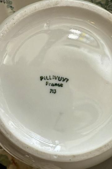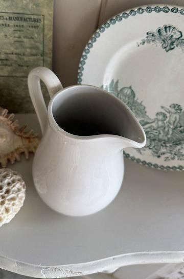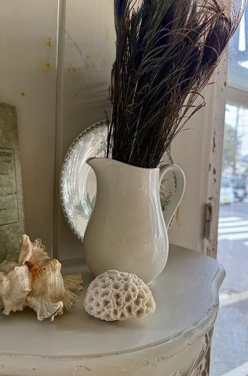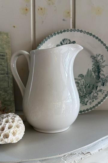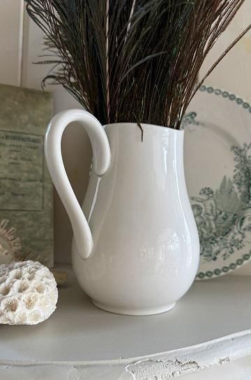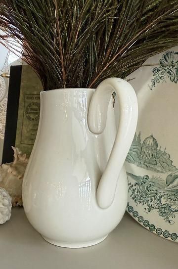 フランスのポッタリー、ピリヴィッツ(Pillivuyt)製、シンプルで洗練されたデザインのピシェ。ずしりと重く、ぽってりした白い陶器製のジャグです。全体的に優しいカーブを描いた、優しいシルエットのピシェは、幅広く使いやすそうな形。注ぎ口はなめらかで、一番高くなっています。ハンドルは大きく、4本の指が入りしっかり掴めます。昔の手作り陶器が年月を経過した風合いがアンティークならではの味わいを出し、魅力となっています。アンティークのあるテーブルコーディネートに、ウォータジャグやミルクジャグとして。または花瓶やディスプレーオブジェとしても扱いやすいサイズ感です。100年以上昔に作られた、手作りの古い陶器ならではのぽってり厚い不均一さや味わい、温もりが魅力のピリヴィッツ製フレンチアンティークピシェです。 | ![]() | ||||||||||||||