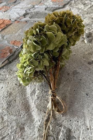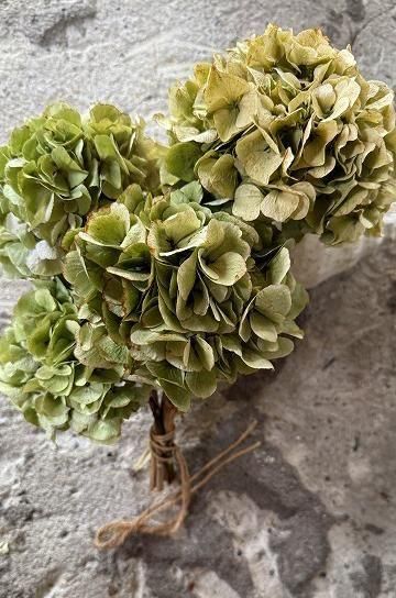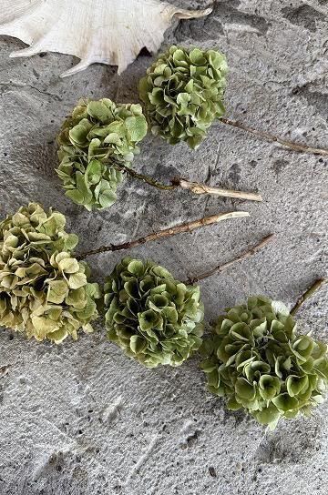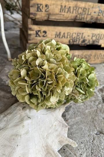 繊細な質感と、儚げなグラデーションカラーが美しい紫陽花のオランダ製ドライフラワー。グリーンのニュアンスカラーのやわらかい雰囲気が可愛いドライフラワーです。アンティーク家具やブロカント小物等、アンティークのあるディスプレーにマッチする、マットで枯れた風合いが魅力的な、あじさいのドライフラワー。朝のうちに摘んで、丁寧にドライにした紫陽花達です。花の風合いが時間の経過と共にゆっくりと淡い色合いとなってゆくのを楽しんで。アンティークと相性ぴったりの、美しい紫陽花のドライフラワーは1輪で花瓶に挿したり、ブーケにしてボリューム感を楽しんでも。あじさいの花は日本でももちろん人気ですが、フランスでは元気な女性という花言葉で人気の、ガーデナー達のお気に入りの花の一つで、良く見かけます。このままオブジェとして、シェルフに寝かせて飾ったり、逆さに吊るしてドライの風合いを楽しみながら飾ったり、花瓶にさしてふんわり広がる花のボリュームを楽しんだり。どこに飾っても絵になる、紫陽花のドライフラワーです。 | ![]() | ||||||||||||||