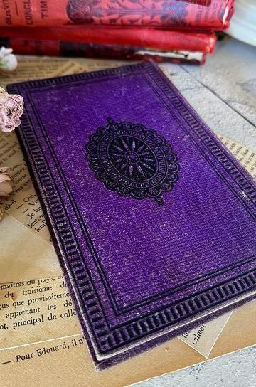 パープルの装丁に、エンボス模様の凹凸と、ゴールドとブラックの塗装で繊細に表現された柄が素敵な装丁のアンティーク本です。