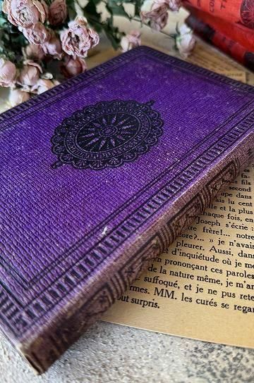 フレンチアンティークの洋書の古本です。エンボス加工された紋章のような美しい表紙と、古びた風合いが絵になるフレンチアンティークブック。パープルの装丁に、エンボス模様の凹凸と、ゴールドとブラックの塗装で繊細に表現された柄が素敵な装丁のアンティーク本です。上品な印象の本には、キリスト教青年団の文字が書かれています。タイトルは「三人の母親」と書かれています。フランス語の文章と、表紙に1枚のリトグラフ画が楽しめます。迫力のある美しい装丁のアンティーク本。内容や美しいイラストはもちろん、置くだけでインテリアとしても活躍してくれる、古びたフレンチアンティークブックです。