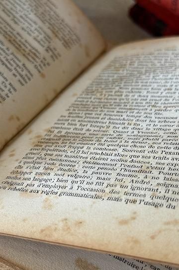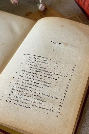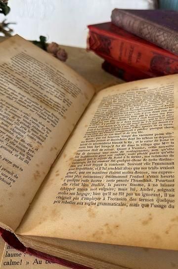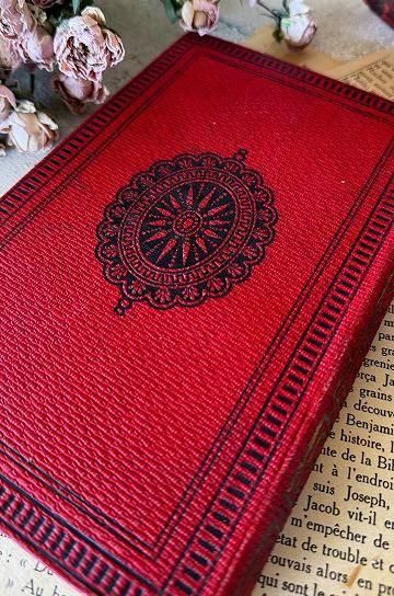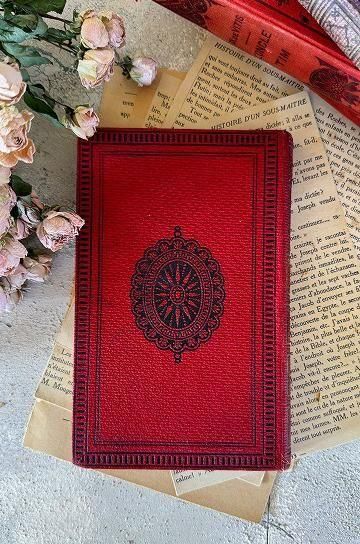 フレンチアンティークの洋書の古本です。エンボス加工された紋章のような美しい表紙と、古びた風合いが絵になるフレンチアンティークブック。レッドの装丁に、エンボス模様の凹凸と、ゴールドとブラックの塗装で繊細に表現された柄が素敵な装丁のアンティーク本です。上品な印象の本には、キリスト教青年団の文字が書かれています。タイトルは「三人の母親」と書かれています。フランス語の文章と、表紙に1枚のリトグラフ画が楽しめます。迫力のある美しい装丁のアンティーク本。内容や美しいイラストはもちろん、置くだけでインテリアとしても活躍してくれる、古びたフレンチアンティークブックです。 | ![]() | ||||||||||||||