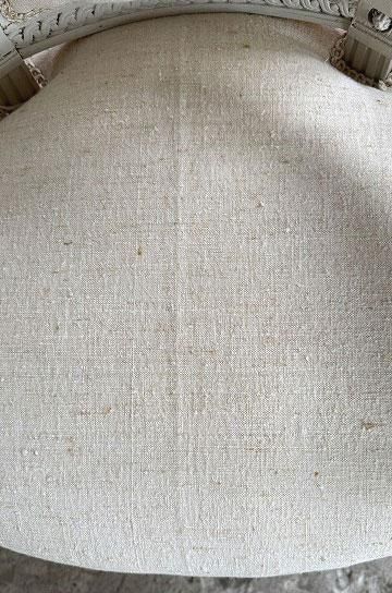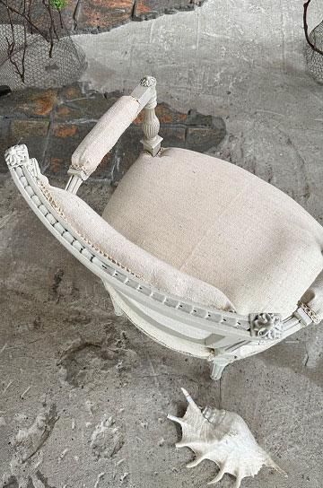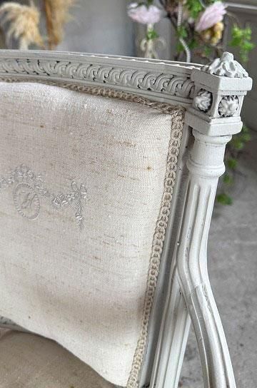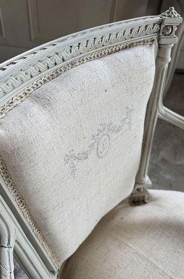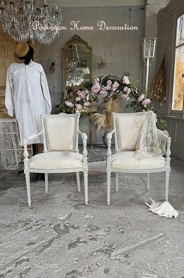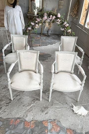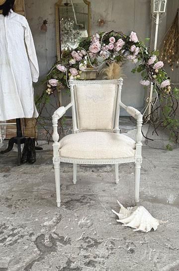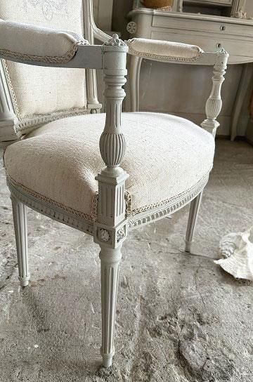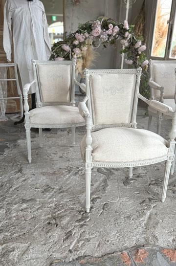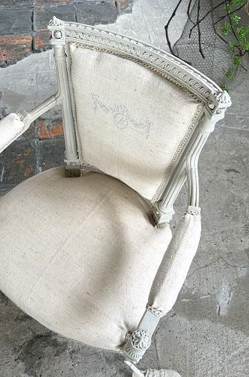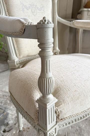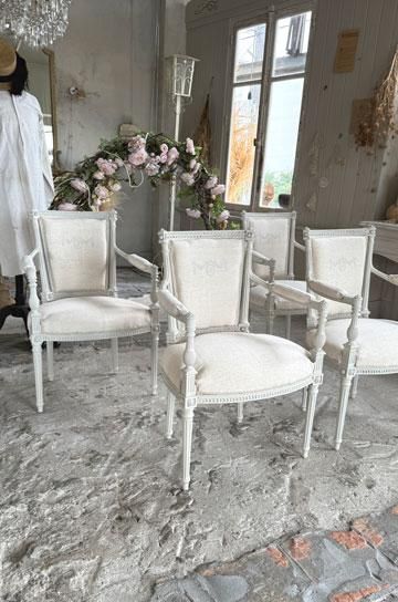 フレンチアンティークのルイ16世アームチェアc。家具職人と彫刻職人によって丁寧に作られた細いシルエットの背もたれがカーブしたデザインが美しい。コーナーにはロゼッタ彫刻が施された凹凸の深い職人気質を感じる調和のとれた美しいデザインです。背もたれはガドルーニングの繰り返す模様は永遠の願が込められています。脚はストレートのフルーディングのフルーテッドレッグで、伝統的なルイ16世様式。座面は蒲鉾型でダイニングテーブルに合わせてちょうどいい座面の高さが使いやすいアームチェア。マリーアントワネットの為に製作された、ジョルジュジャコブスがデザインされたネオクラシシズムの1900年製作のアームチェアです。シャトーの客間の装飾家具等として製作されたたルイ16世アームチェア。繊細な彫刻とアンティークならではの存在感のある、フレンチアンティークのルイ16世アームチェアです。 | ![]() | ||||||||||||||