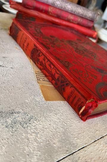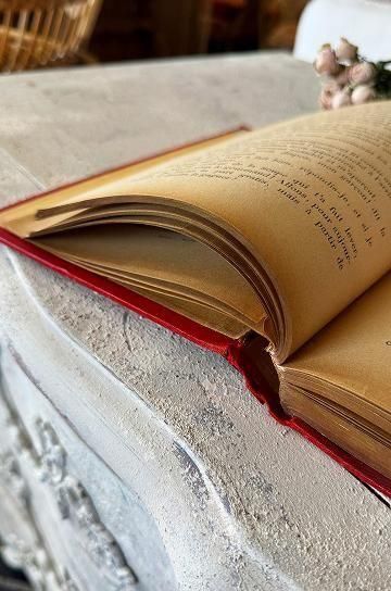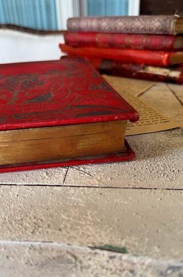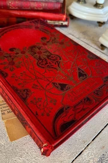 ![]() フレンチアンティークの洋書の古本です。エンボス加工された紋章のような美しい表紙と、古びた風合いが絵になるフレンチアンティークブック。  | ![]() レッドの装丁に、エンボス模様の凹凸と、ゴールドとブラックの塗装で繊細に表現された柄が素敵な装丁のアンティーク本です。  | ||||||||||||||