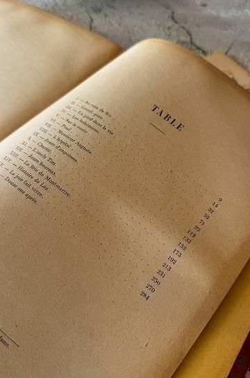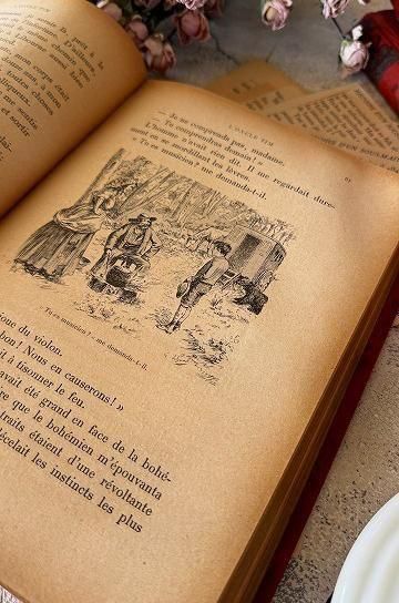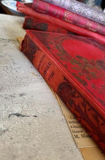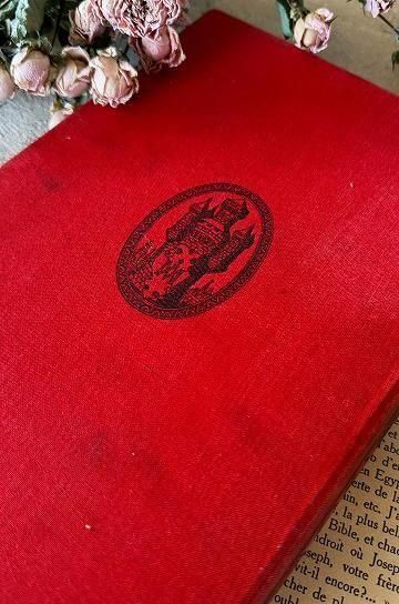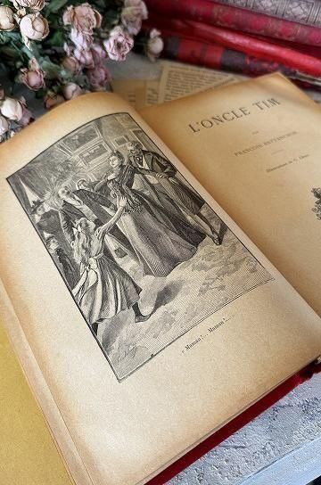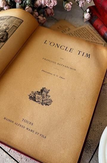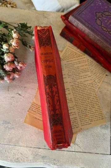 フレンチアンティークの洋書の古本です。エンボス加工された紋章のような美しい表紙と、古びた風合いが絵になるフレンチアンティークブック。レッドの装丁に、エンボス模様の凹凸と、ゴールドとブラックの塗装で繊細に表現された柄が素敵な装丁のアンティーク本です。上品な印象の本の表紙には編集社の名前、背表紙には題名の『ティムおじさん』の文字が書かれています。本文の前にある文字にはキリスト教徒に捧げますとの文字があるため、関わりのある内容かと思われます。繊細なタッチの挿絵が多く含まれていて見ごたえがあります。迫力のある美しい装丁のアンティーク本。内容や美しいイラストはもちろん、置くだけでインテリアとしても活躍してくれる、古びたフレンチアンティークブックです。  | ![]()  | ||||||||||||||