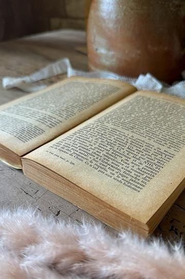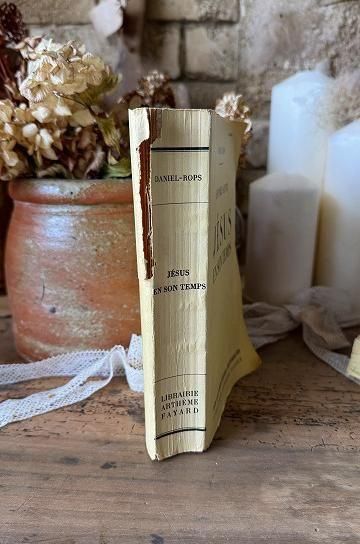 フランスのアンティークの本。ダニエル・フロップスによるキリストの歴史に関しての本。ダニエル・フロップスは、フランスのカトリック作家兼歴史家として1920年頃から作品を生み出しています。この作品もイエスとその時代背景に関しての話が綴られています。昔ながらの荒く厚い紙に印刷された文字のインクが味のある雰囲気。大きい紙にまとめて印刷してから裁断される作り方で、紙の端部分はアンティークでないと表現出来ないであろう風合いです。年月を経た紙がアンティークならではの佇まい。不ぞろいな紙の縁は何度も読まれてくるんと丸まって広がって、使い込まれた風合いです。このままアンティークなディスプレーに、小物と合わせて世界観を創ったり、キャビネットやシェルフを飾るオブジェに。古い紙とインクの風合いが味のある、フランス語のアンティークブックです。 | ![]() | ||||||||||||||