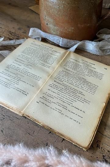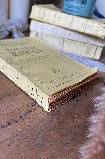 フランスのアンティークの本。ジョルジュ・ド・ポルト・リッシュの戯曲集「愛の劇場」の1巻。「フランソワーズの幸運」と「老いた男」の2つの作品が収録されています。ジョルジュ・ド・ポルト・リッシュは、フランスの劇作家として1972年頃から作品を生み出しています。この本には役者の台本となる言葉たちがそのまま綴られています。昔ながらの荒く厚い紙に印刷された文字のインクが味のある雰囲気。大きい紙にまとめて印刷してから裁断される作り方で、紙の端部分はアンティークでないと表現出来ないであろう風合いです。年月を経た紙がアンティークならではの佇まい。不ぞろいな紙の縁は何度も読まれてくるんと丸まって広がって、使い込まれた風合いです。このままアンティークなディスプレーに、小物と合わせて世界観を創ったり、キャビネットやシェルフを飾るオブジェに。古い紙とインクの風合いが味のある、フランス語のアンティークブックです。 | ![]() | ||||||||||||||